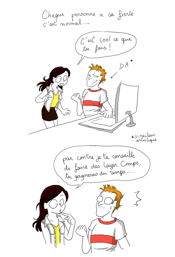 • Bon, il faut que tu saches qlq chose : …. un DA c’est un peu un Dieu, si tu en sais plus que lui et que tu ne lui dis pas il te donnera des conseils inutiles et te prendra sous son aile. Si tu en sais plus que lui et que tu lui dis il dira de mal de toi a tout le monde et s’arrangera pour que tu te retrouves à monter toutes les maquettes de 32 pages en 2 exemplaires le soir à 19 pour le lendemain 8 heure…