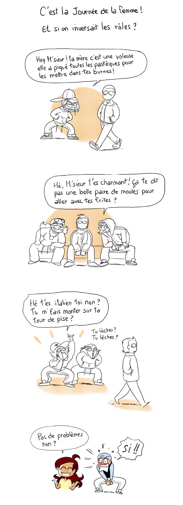 Tiens, ça me donne bien envie de faire une bd entière sur le sujet. Le vêtement de base serait la jupe, et les garçons seraient jugés vulgaires lorsqu’ils mettraient des pantalons… Les abdos seraient aussi obscènes que les seins des femmes… reste a trouver un équivalent de l’exision.