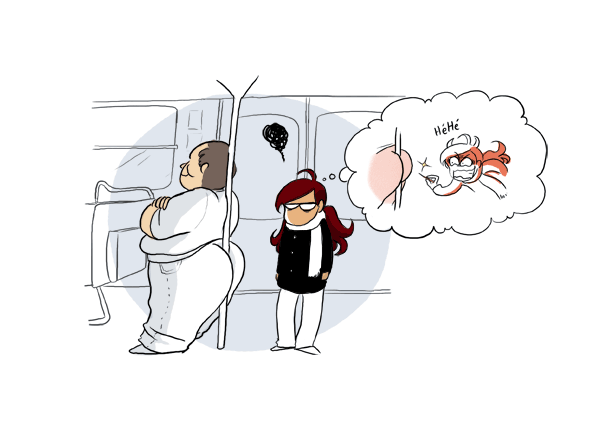Un jour une nana comme ça s’état aussi carrément appuyée sur ma main avec son dos en entrant. Non seulement je ne me suis pas retirée mais en plus j’ai fait exprès de bien remuer les phalanges pour la faire ch*** et elle n’a pas cessé de se tortiller de tout son voyage. Moi aussi ça me saoule ces gens qui prennent les barres pour des sièges.