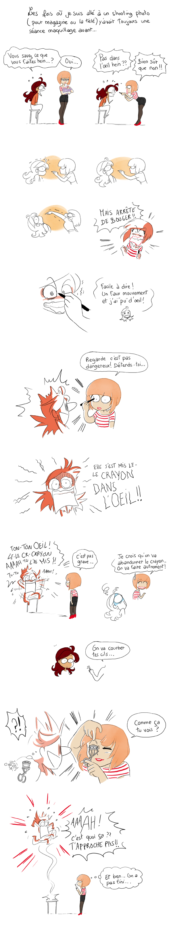 J’ai exactement la même réaction quand on essaye de me maquiller ! Et paradoxalement je met des lentilles. Enfin je met 2 heures à les mettre… Ca ressemble à cette scène mais à la place de la maquilleuse bin c’est moi, j’sais pas si vous pigez…