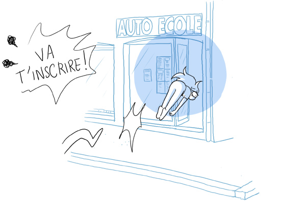 Ouh que je me reconnais dans cette planche… Sauf que, catastrophe et clous de girofle, personne ne m’a trainee par quelque peau que ce soit jusqu’a l’auto-ecole… Total, j’y pense enfin pour de bon a 29 ans et… en Australie. Ou, soit dit en passant, c’est vachement plus simple et moins cher qu’en France. Qui c’est qui pourra bientot (enfin, peut-etre) se vanter de son permis australien ? ^^