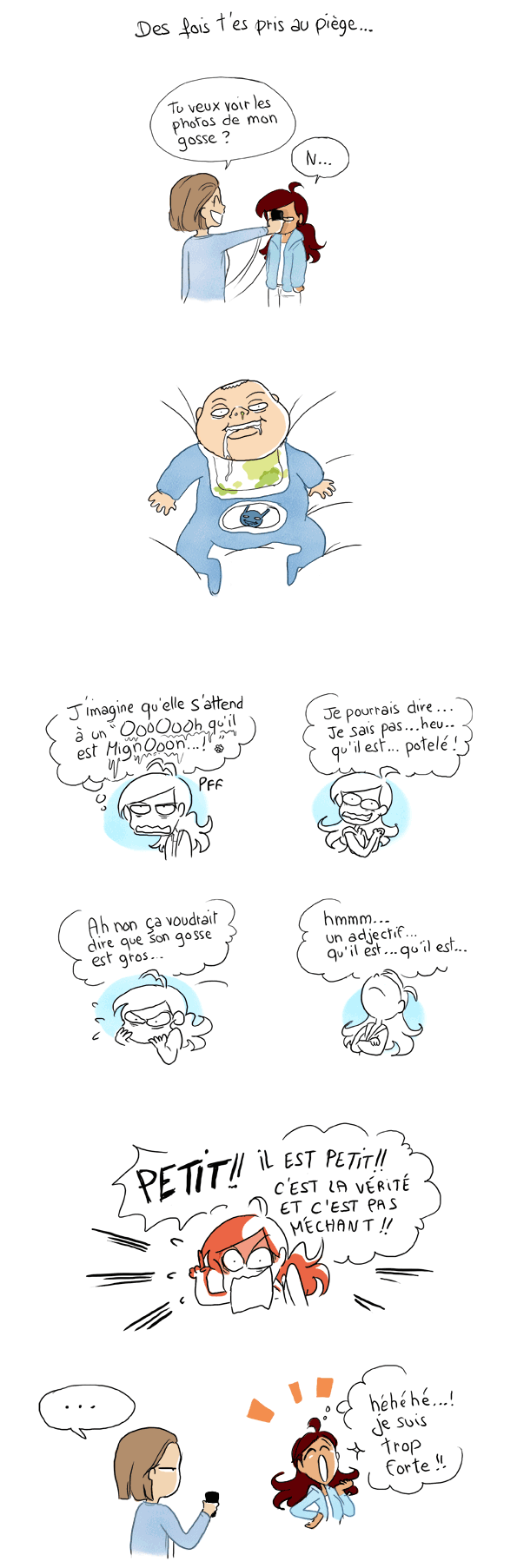 les gens qui me connaissent bien savent que je pense de façon générale que les bébé qui viennent de naitre sont moches. donc ils s’attendent pas à ce que je fasse de compliments.